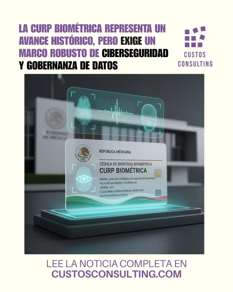 Custos Consulting: la CURP biométrica marca un avance histórico, pero requiere un marco sólido de ciberseguridad y gobernanza de datos México ha dado un paso decisivo hacia la digitalización nacional con el inicio oficial de la expedición de la Clave Única de Registro de Población (CURP) con datos biométricos, un proyecto que busca consolidar la identidad digital de los ciudadanos dentro de la Plataforma Única de Identidad. El nuevo documento incorporará huellas dactilares, escaneo de iris, fotografía digital y firma electrónica, elementos que, correctamente gestionados, permitirán una trazabilidad más eficiente y confiable de los datos personales. Sin embargo, Custos Consulting advierte que este avance conlleva retos significativos en materia de ciberseguridad, privacidad y gobernanza de la información, que deben ser atendidos desde el inicio del proceso. 🔐 Transformación digital con riesgos inherentes Desde la perspectiva de Custos Consulting, la CURP biométrica representa un hito en la modernización administrativa del país, pero su éxito dependerá directamente de la solidez del marco de protección de datos y la infraestructura tecnológica que lo respalde. Los datos biométricos —por su naturaleza permanente e irremplazable— requieren protocolos avanzados de resguardo, encriptación, anonimización y monitoreo continuo. Una brecha o filtración en esta información podría tener consecuencias irreversibles, afectando la confianza pública y la integridad del sistema de identidad digital. Custos Consulting sostiene que la ciberseguridad debe ser tratada como un pilar estratégico, no solo como un componente técnico. Implementar un enfoque preventivo, basado en estándares internacionales, es clave para proteger la información y garantizar la continuidad operativa de la plataforma. ⚙️ Ejes críticos de gobernanza y cumplimiento Desde el punto de vista empresarial y de gestión del riesgo, Custos Consulting identifica tres líneas prioritarias para asegurar una implementación responsable: Estos pilares son esenciales para construir una identidad digital segura, confiable y auditable, que refuerce la confianza de los ciudadanos y las instituciones. 🧭 Custos Consulting y la confianza digital Para Custos Consulting, la confianza digital se convierte en un activo estratégico nacional. La protección de la información personal y biométrica debe abordarse con la misma rigurosidad con que una empresa protege sus activos financieros o su reputación corporativa. La implementación de políticas basadas en ISO/IEC 27001, 27701 y marcos de gestión de riesgos es fundamental para asegurar un ciclo de vida responsable de los datos, desde su recolección hasta su eliminación segura. 🧩 Conclusión La CURP biométrica simboliza un avance tecnológico y de gobernanza sin precedentes, pero su sostenibilidad dependerá de un enfoque integral de ciberseguridad, gobernanza de datos y responsabilidad institucional. Desde Custos Consulting, reiteramos nuestro compromiso con la seguridad de la información, la transparencia tecnológica y la resiliencia digital, promoviendo una cultura de protección que permita a México avanzar con confianza hacia una identidad digital sólida y ética. #CustosConsulting #Ciberseguridad #GobernanzaDeDatos #GestiónDeRiesgos #CURPBiométrica #IdentidadDigital #ISO27001 #CustosAcademy